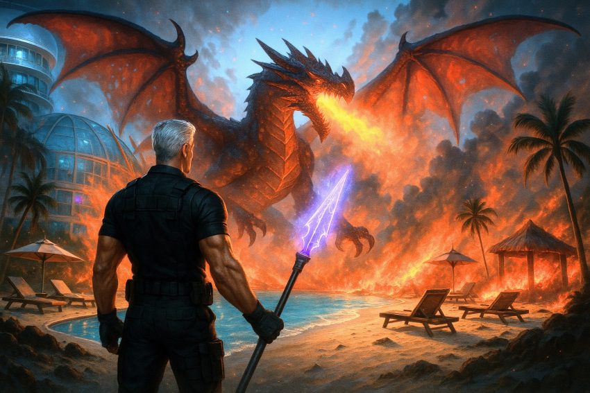 “The gigantic red dragon was absolutely destroying the Azure Shores Luxury Resort. Its wings smashed through a row of glass-domed gardens, raining tropical orchids and steel beams onto the pristine infinity pool below. A cabana exploded in fire as its tail lashed sideways, scattering deck chairs and sending jet skis cartwheeling across the sand. The…